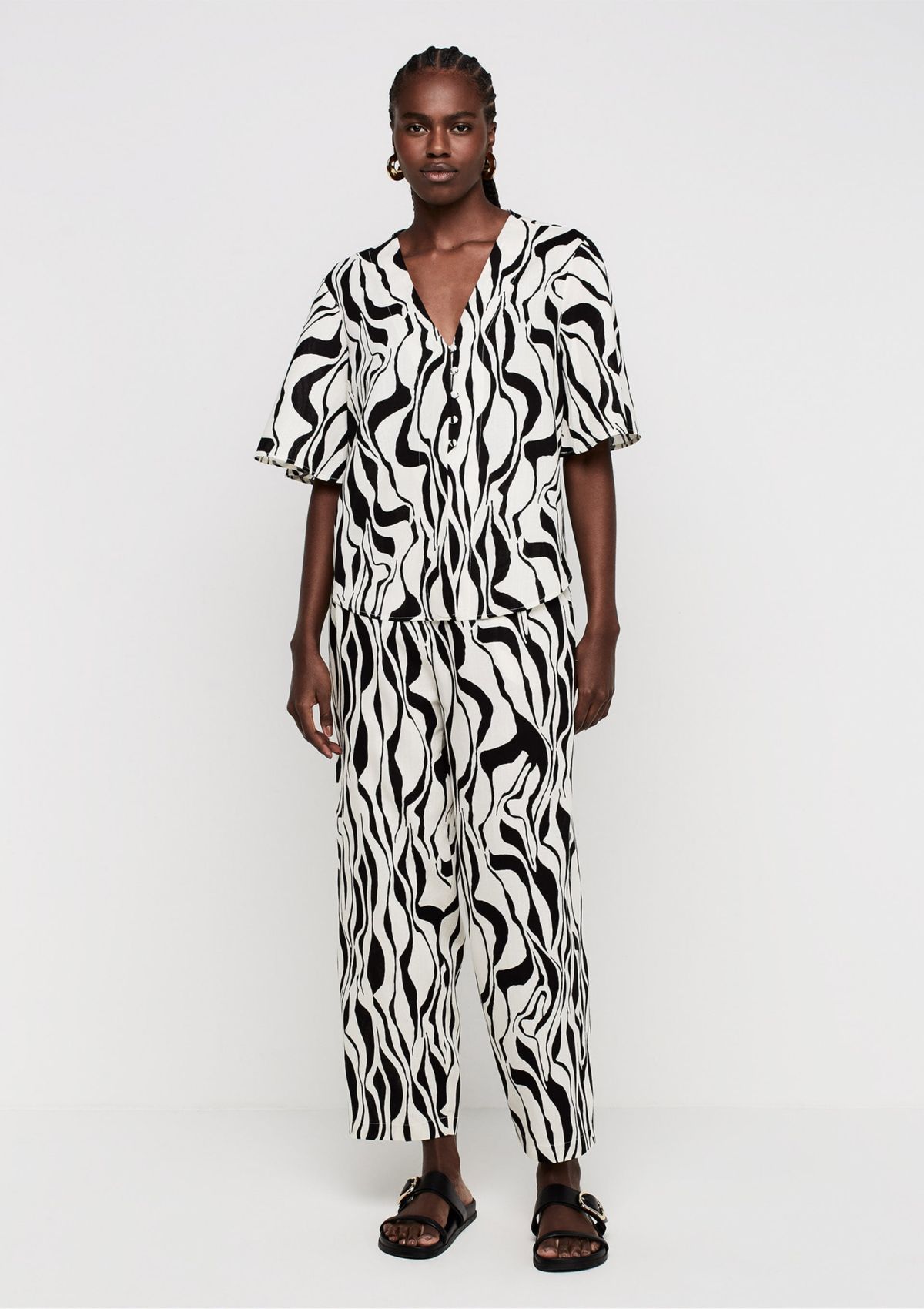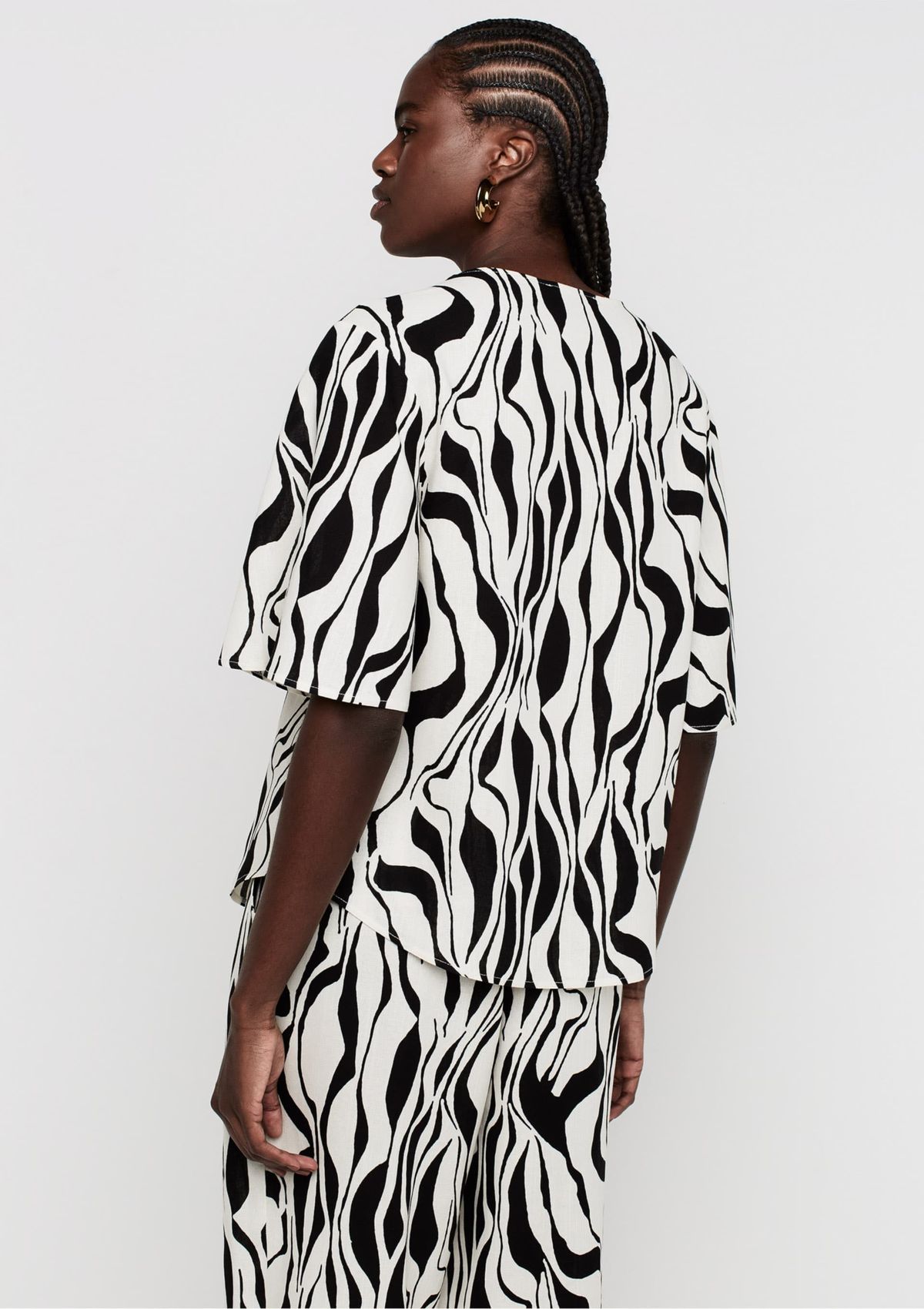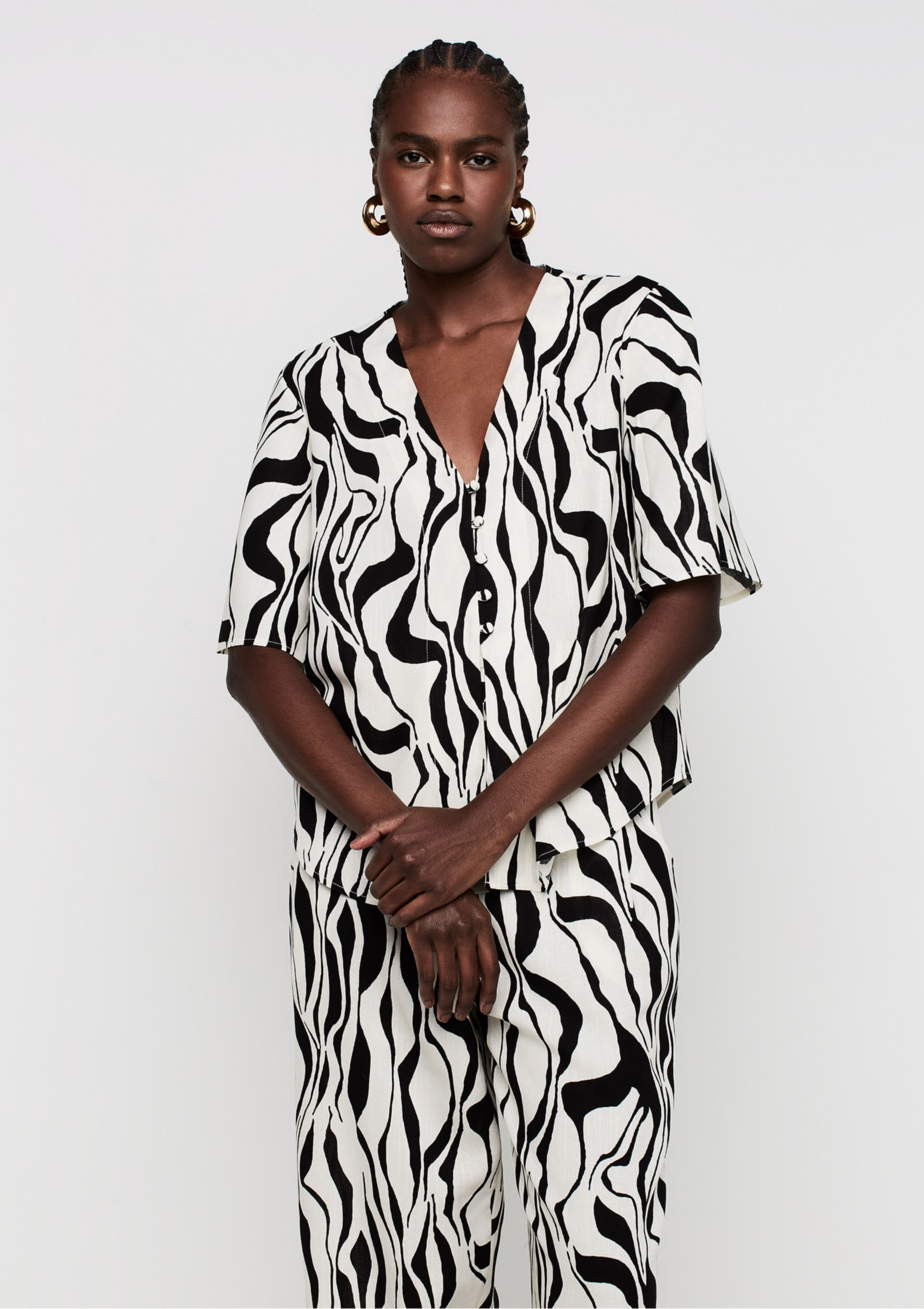 Blusa Decote V Com Linho Preto e Branco - Estampada