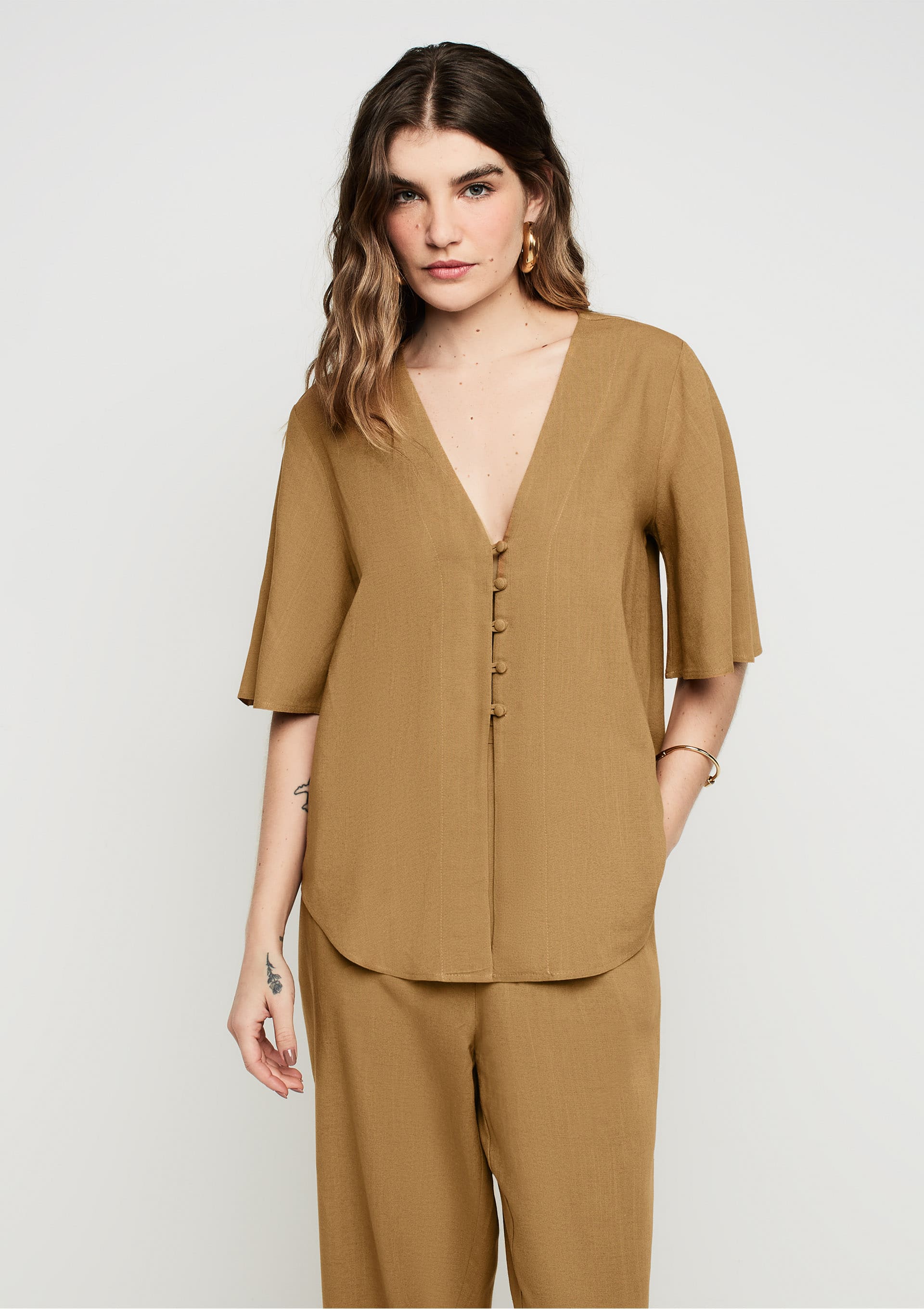 Blusa Decote V Com Linho - Marrom