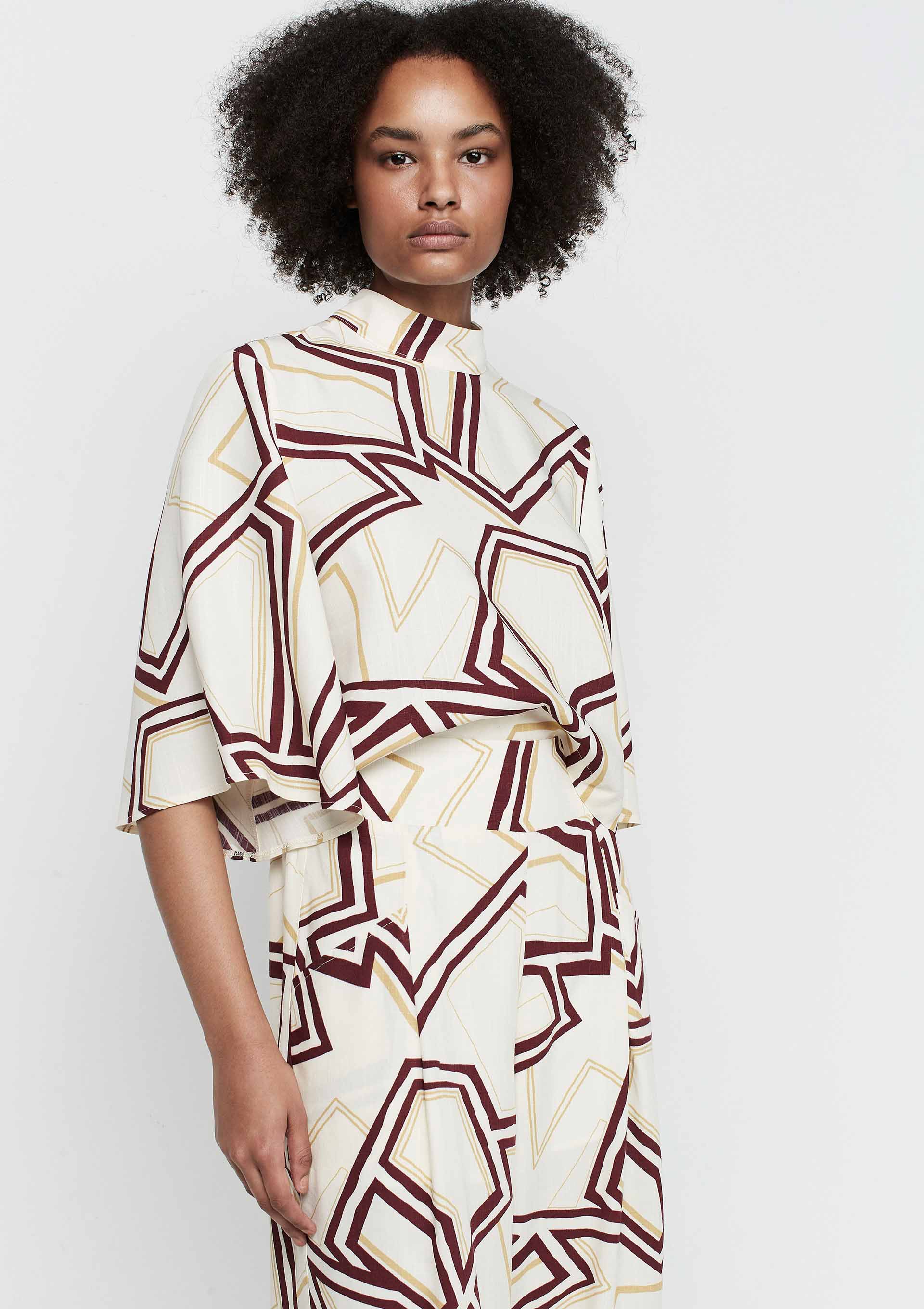 Blusa Gola Alta Em Viscose Texturizada Off-White e Vinho - Estampada