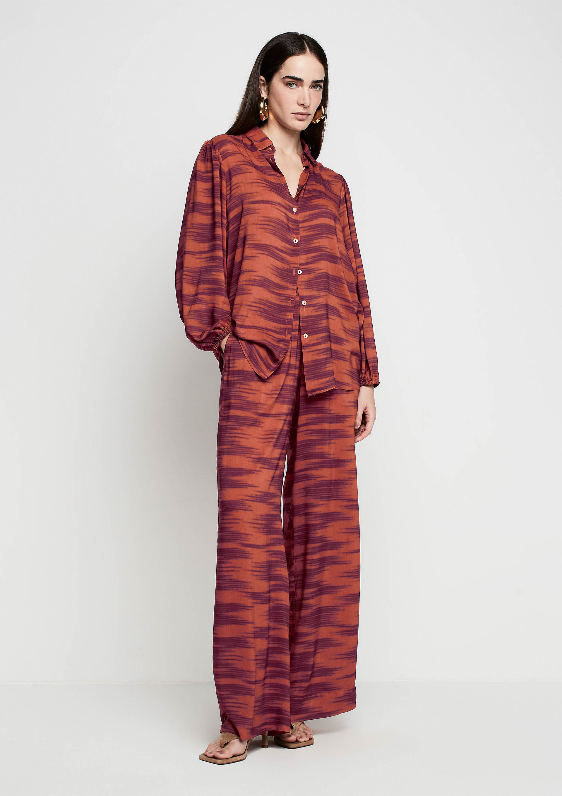 Camisa Ampla Em Viscose Laranja e Vinho - Estampada