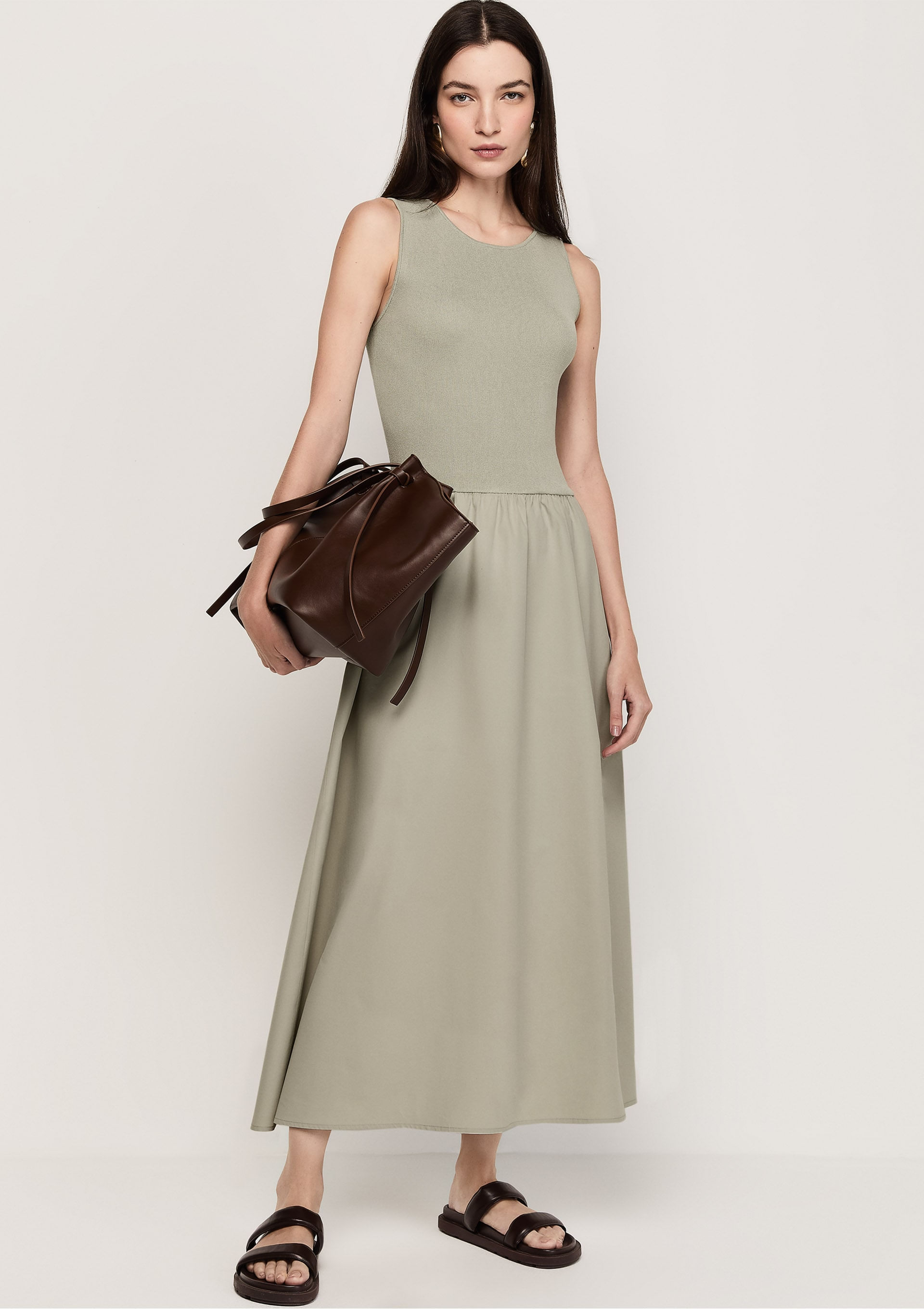 Vestido Evasê em Tricô e Popline com Decote Redondo - Cinza