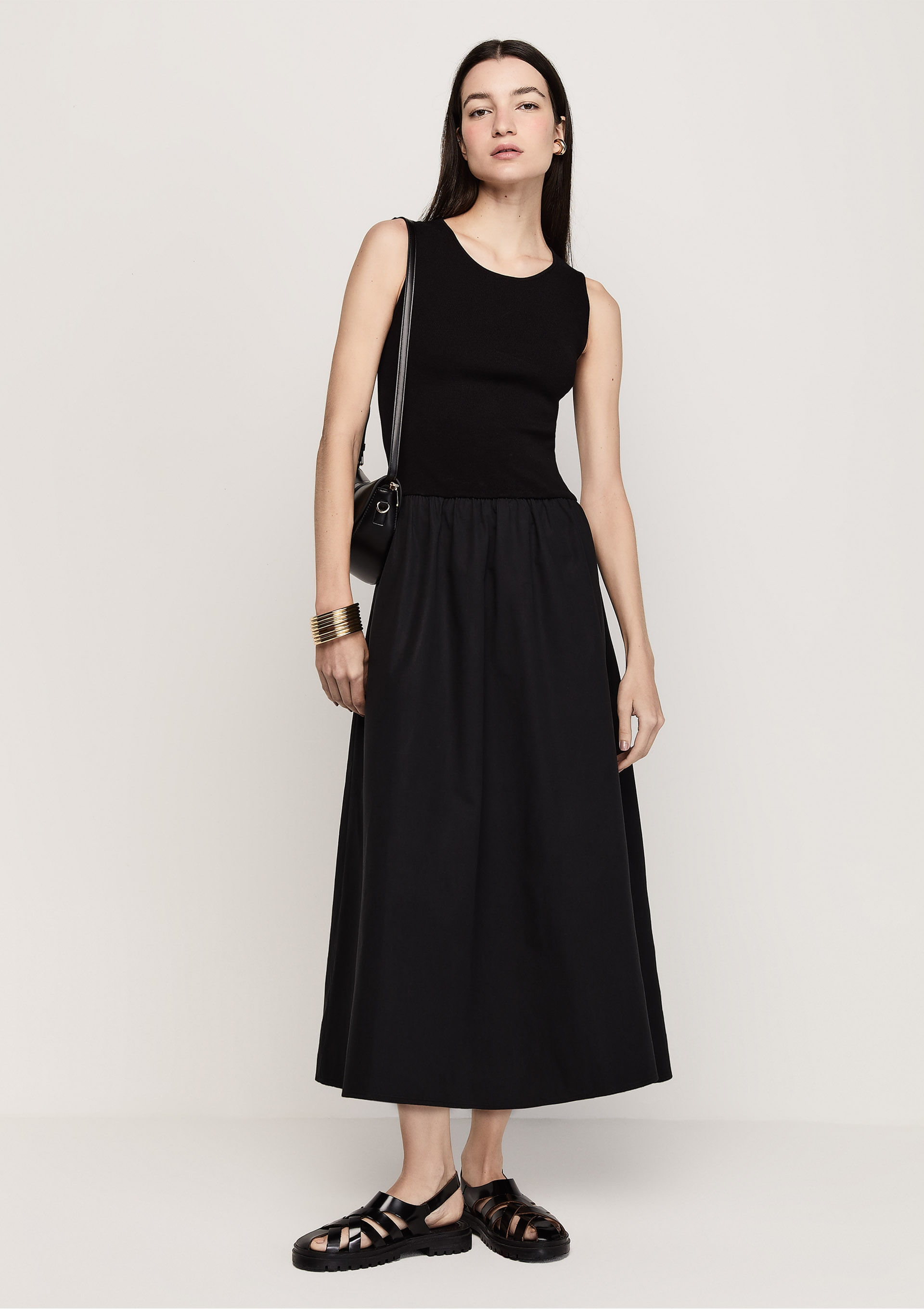 Vestido Evasê em Tricô e Popline com Decote Redondo - Preto